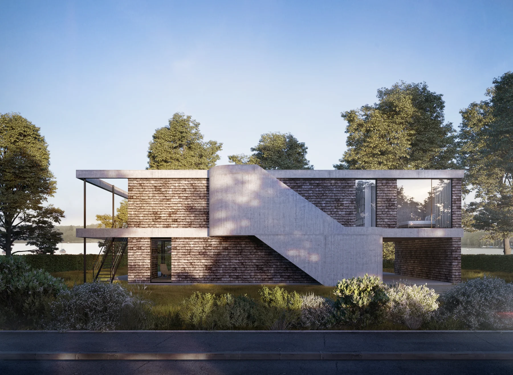 Auf einem Seegrundstück im Münchner Fünf-Seen-Land, umgeben von altem Baumbestand, entstand ein Ferienhaus mit klarer Ausrichtung zum Ostufer und offenen Raumbezügen. Das Volumen ist mit Holzschindeln bekleidet, durch horizontale Sichtbetonelemente gegliedert und öffnet sich mit großzügigen Glasflächen zum See.