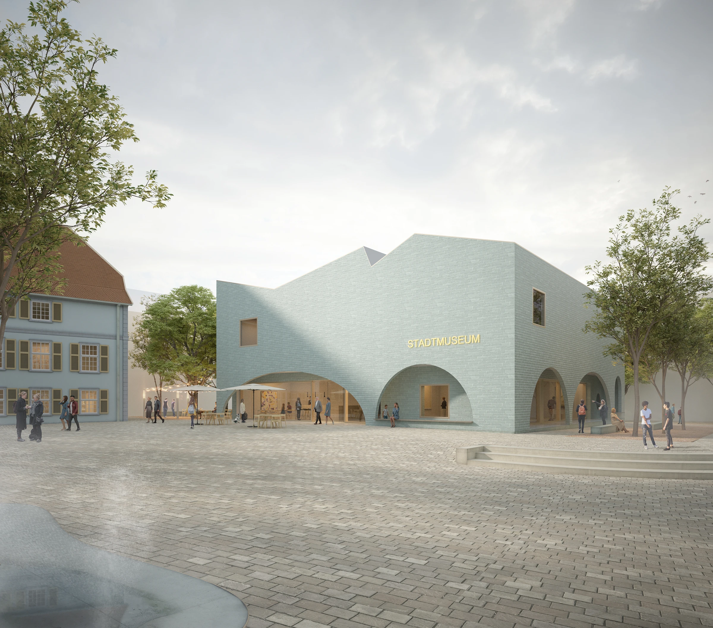 Die Visualisierung selbst ist aus einer leicht schrägen Perspektive über den Platz komponiert, sodass sowohl das Gebäude als auch der öffentliche Raum davor erlebbar werden. Weiches, diffuses Licht und eine zurückhaltende Farbpalette lassen die Materialität der Fassade und die Atmosphäre des Platzes in den Vordergrund treten. Einzelne Figuren und Aufenthaltsbereiche beleben die Szene und vermitteln die Idee eines offenen, von Bürgerinnen und Bürgern genutzten Kulturortes.